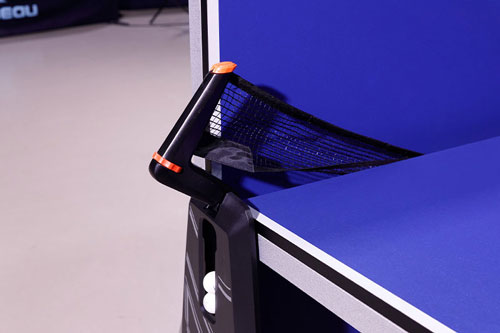 Bodite pozorni na model 500 Indoor. Ko postavite mizo, se mreža samodejno postavi v položaj. S koleščkom na dnu mreže izberite pravo višino za svojo igro. Nato napetost prilagodite tako, da preprosto povlečete vrvico in jo blokirate s sponko. Vaša mreža je popolnoma prilagojena in tako ste pripravljeni na igro.