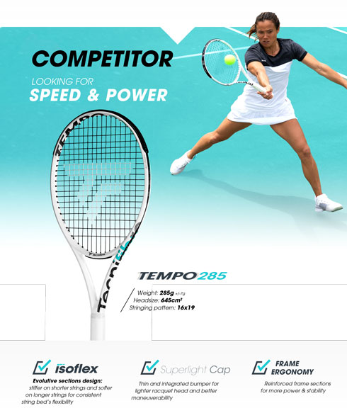 Kolekcija ženskih loparjev Tecnifibre Tempo je bila ustvarjena, da igralkam zagotovi največjo moč, manevrirnost in dovolj spina.