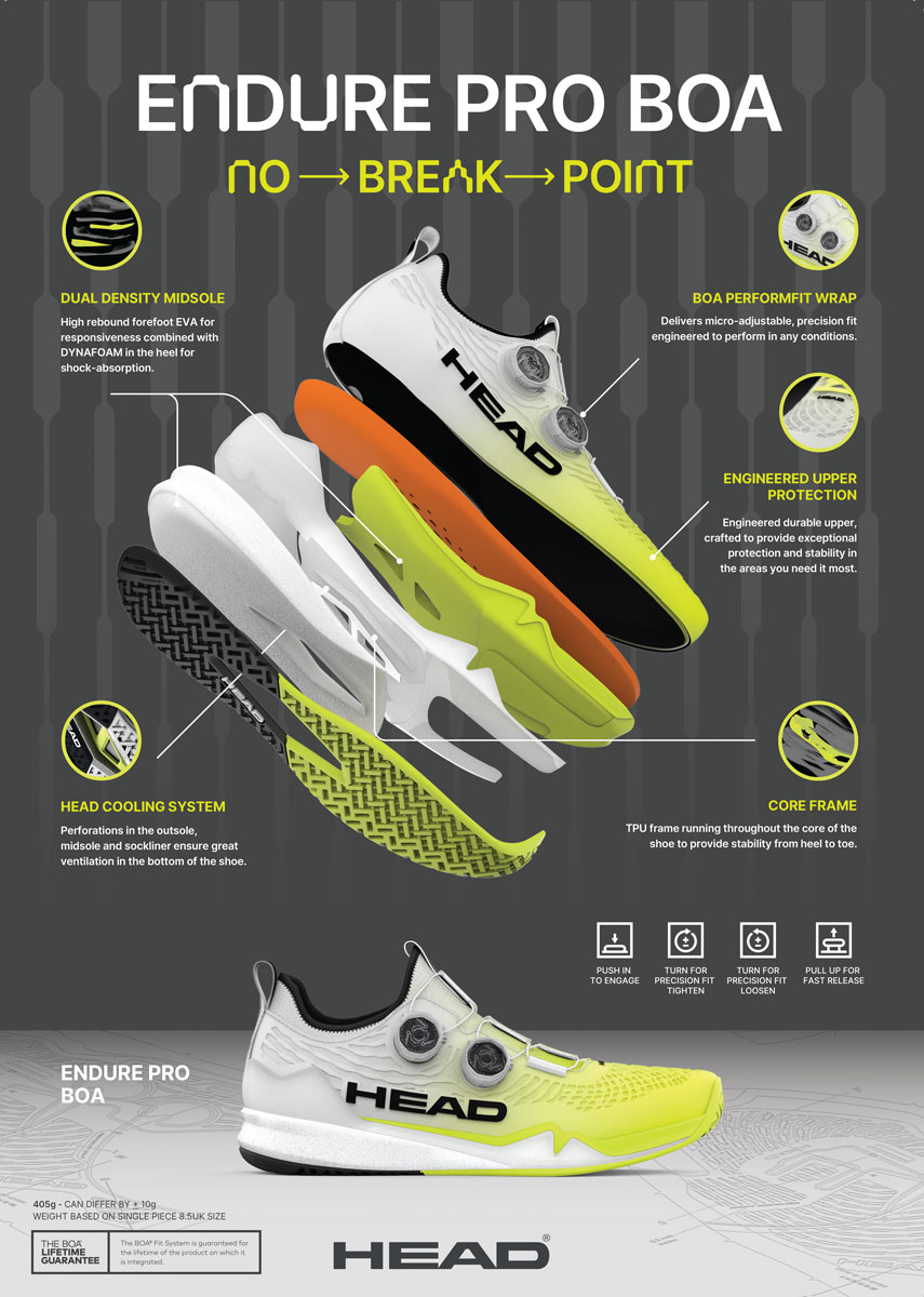 so del nove serije ENDURE, ki združuje najboljše iz modelov REVOLT in SPRINT, copati HEAD ENDURE PRO BOA CLAY MEN predstavljajo vrhunec inovacij in zmogljivosti za peščene podlage. Z dvema Li2 BOA® koleščkoma in tehnologijo PerformFit™ Wrap omogočajo natančno, mikro-nastavljivo prileganje in izjemno stabilnost pri stranskem gibanju.
