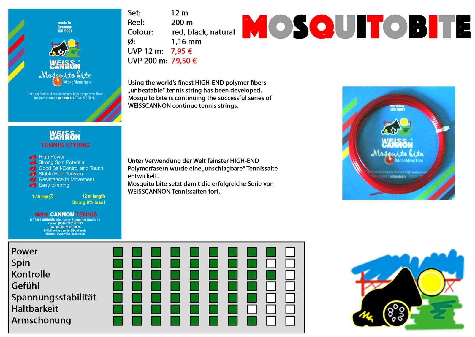 Ob uporabi najtanjšega visoko kvalitetnega polimera je nastala nepremagljiva teniška struna Weiss Cannon Mosquito Bite. Struna se tako kot ostale izdeluje v nemčiji pod standardom ISO 9001 in je ena izmed številnih visoko kvalitetnih strun podjetja Weiss Cannon. Struna nudi neverjetno odzivnost, veliko moč, odličen spin in zelo dobro kontrolo. Kot takšna je idealna za igralce zadnje linije. Mosquito bite poleg vsega prej naštetega nudi še izredno veliko občutka.