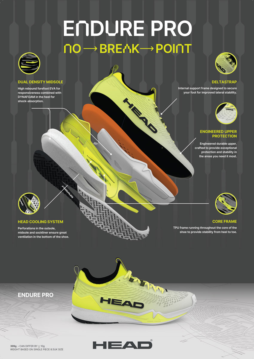 HEAD Endure Pro CLAY men je vrhunski teniški copat za peščene podlage, ki združuje hitrost, stabilnost in vzdržljivost.