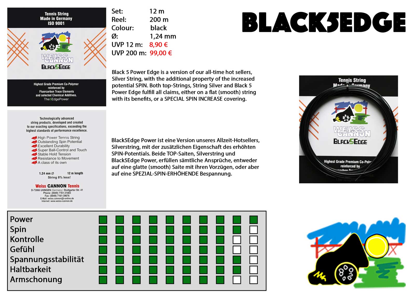 Povsem nova struna Weiss Cannon Black5Edge Power je nastala na podlagi njihove najbolje prodajane strune Silverstring. Po številnih testiranjih ki so jih opravili, so ugotovili, da daje 5 kotna oblika najbolj optimalen spin v kolikor je uporabljena POLYAMID-na struna, hkrati pa nudi dodatno moč. Namenjena je vsem bolj izkušenim igralcem, ki si želijo odličen spin potencial, dodatno moč in ne pretrdo struno, ki odlično drži napetost napenjanja.